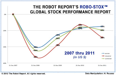 The latest ROBO-STOX™ chart – covering the four year period from 12/31/2007 to 12/31/2011 – shows that worldwide stock performance of robotic stocks over the last four years has been disappointing for investors.